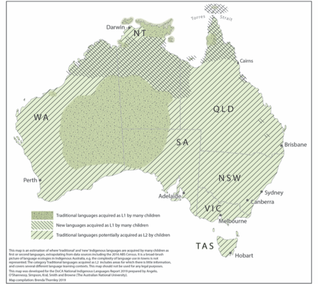 Map showing where children acquire ‘Traditional’ Languages as L1 (first language) or L2 (second or additional language) (WILE p. 15; also NILR).